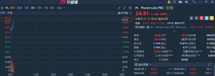 華盛資訊1月12日訊,太空概念股盤初走強,Planet Labs PBC $PL 漲超9%,DXYZ $DXYZ 、回聲星通信漲約5%,克瑞託斯安全防衛 $KTOS 漲超4%。
