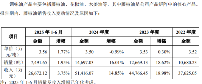 報告期內,公司營收增勢向好,從2022年的4.5億元上升至2024年的6.25億元,2025年上半年達到3.32億元,核心品類調味油是期內主要收入來源,營收佔比超90%,調味油產品主要包括藤椒油、花椒油、木姜油等,其中藤椒油是公司產品矩陣中的核心產品。