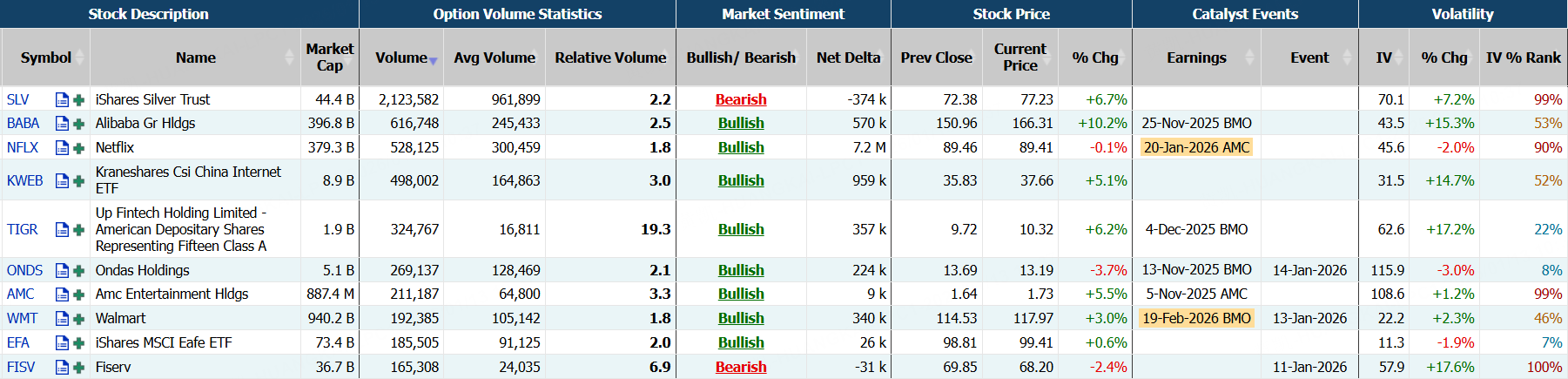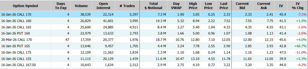 隔夜,阿里巴巴漲超10%,期權合約成交61.46萬張,較90日均量放大2.5倍。1月16日到期的170美元的行權看漲期權交易量特別高,共有38,539份合約交易。 $BABA 20260116 170.0 CALL$