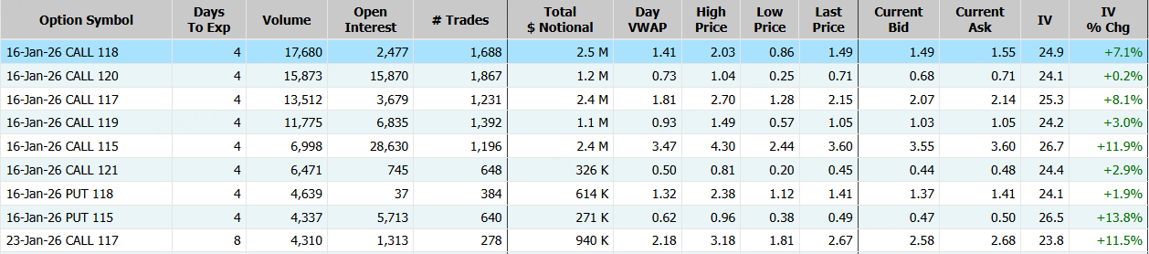 隔夜,沃爾瑪上漲3%,期權合約成交19.24萬張,較90日均量放大1.8倍。1月16日到期的118美元的行權看漲期權交易量特別高,共有17,680份合約交易。 $WMT 20260116 118.0 CALL$