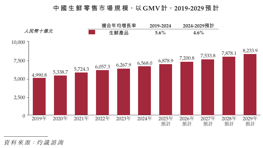 中國生鮮零售市場的市場規模(按GMV計)自2019年的人民幣49,908億元增長至2024年的人民幣65,680億元,複合年均增長率爲5.6%。中國生鮮市場的市場規模將於2029年進一步增長至人民幣82,339億元,自2024年起的複合年均增長率爲4.6%。