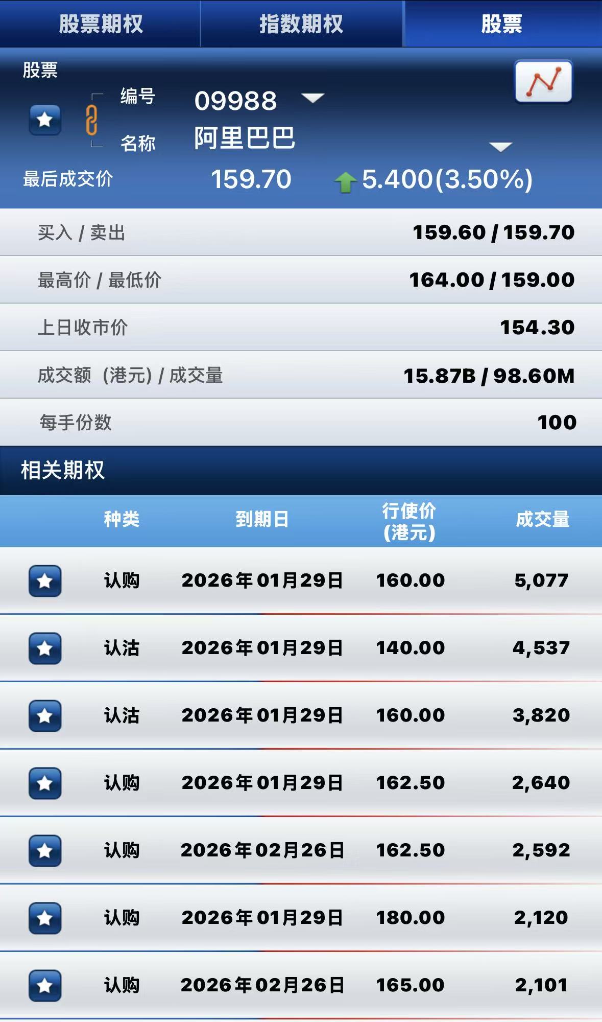 阿里巴巴-W上漲3.5%,期權方面:半日成交超9.5萬張合約,其中於1月29日到期行權價160港元的認購期權成交量居前,成交超5000張合約。 $ALB.HK 20260129 160.00 CALL$