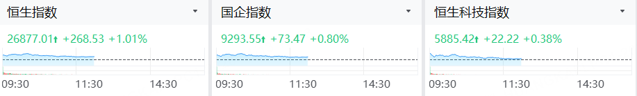 1月13日,港股三大指數齊漲,截止午間收盤,恒指漲1.01%,科指漲0.38%,國指漲0.80%。
