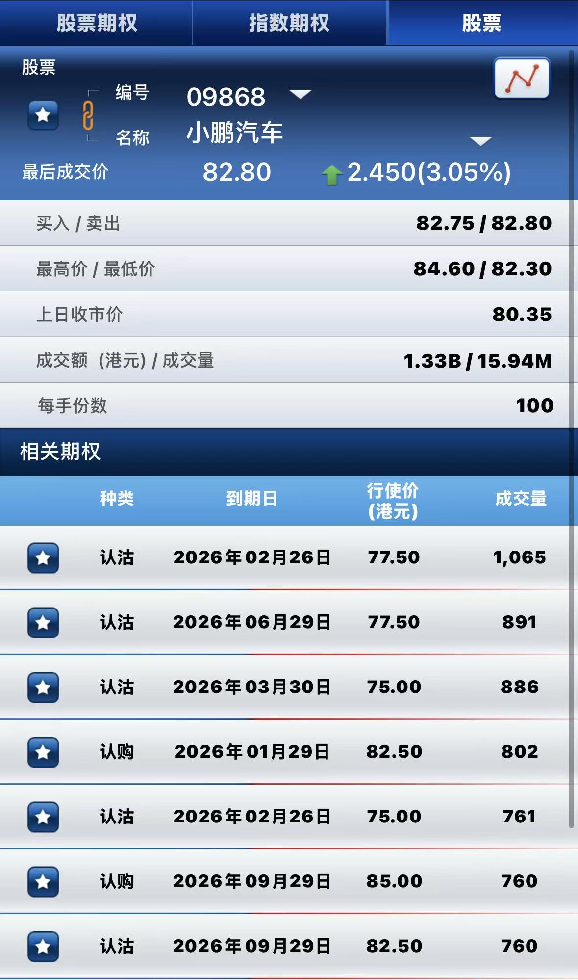 小鵬汽車-W漲超3%,期權方面:半日成交近2.4萬張合約,其中於2月26日到期行權價77.50港元的認沽期權成交量居前,成交超1000張合約。 $PEN.HK 20260226 77.50 PUT$