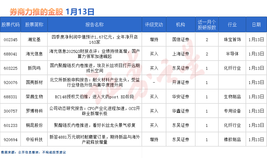 潮宏基最受券商關注,僅1月13日就有國金證券、國信證券等兩份券商研報關注,位居1月13日券商力推股榜首。