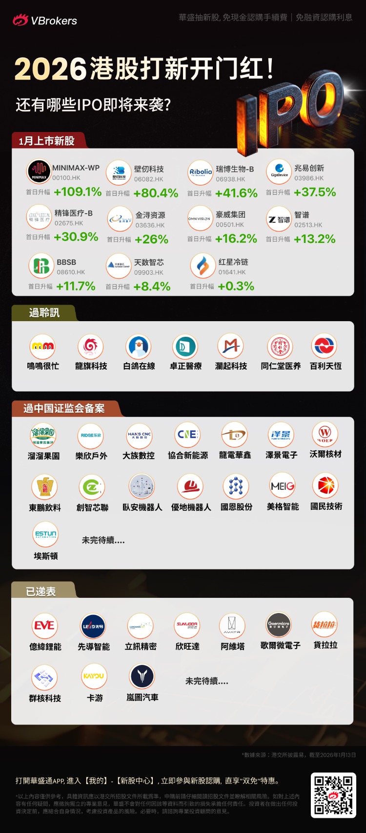 值得注意的是,截止目前,1月上市的11只新股全線收漲,暗盤、首日平均漲幅分別高達67.8%、33.7%。2026年港股打新喜提開門紅,人均“大肉籤”,賺錢效持續爆發!