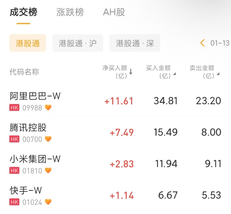 阿里巴巴-W 、騰訊控股、小米集團-W分別獲淨買入10.71億港元、7.56億港元、6.07億港元;