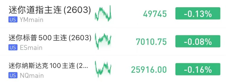 美股三大股指期貨盤前小幅下跌,截至發稿,納指期貨 $NQmain 跌0.16%,標普500期貨 $ESmain 跌0.08%,道指期貨 $YMmain 跌0.13%。