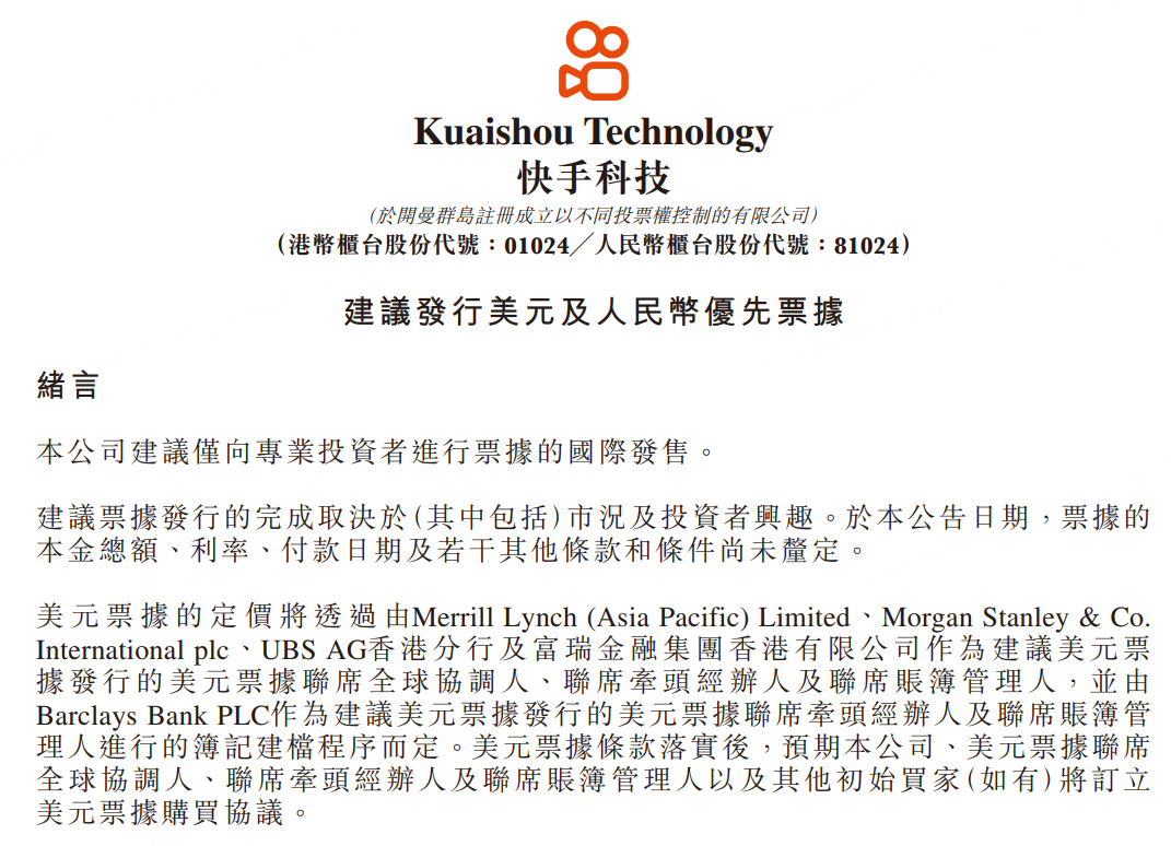 1月14日,快手-W在港交所公告,擬發行美元及人民幣優先票據。擬將票據發行所得款項淨額主要用於一般企業用途。票據的本金總額、利率、付款日期及若干其他條款和條件尚未釐定。