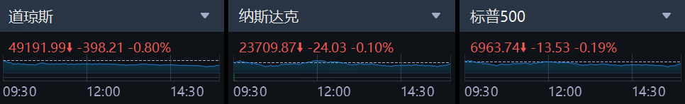 美東時間週二,美股三大指數集體收跌,截至收盤,道指跌398.21點,跌幅爲0.80%,報49191.99點;納指跌24.03點,跌幅爲0.10%,報23709.87點;標普500指數跌13.56點,跌幅爲0.19%,報6963.71點。