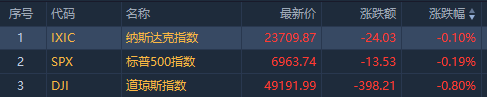美股三大指數集體收跌,截至昨夜收盤,道指跌398.21點,跌幅爲0.80%,報49191.99點;納指跌24.03點,跌幅爲0.10%,報23709.87點;標普500指數跌13.56點,跌幅爲0.19%,報6963.71點。