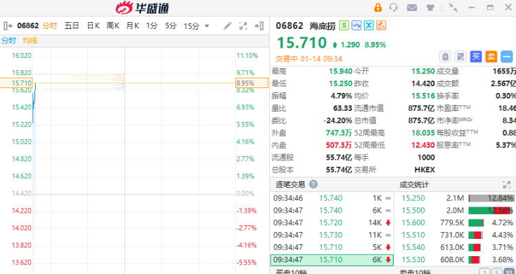 華盛資訊1月14日訊,海底撈早盤高開高走暴漲9%,創始人張勇重任CEO;港股消費股部分走高,截至發稿,農夫山泉大漲5%,友寶在線漲超15%。