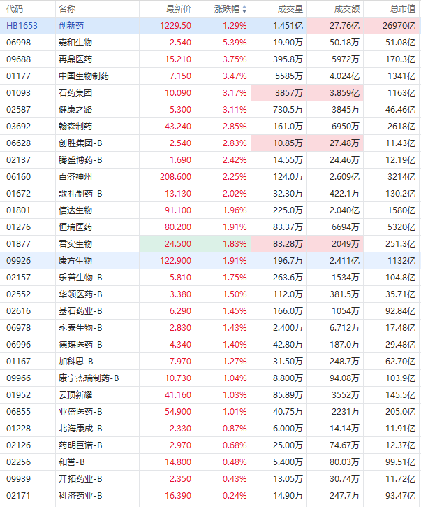 華盛資訊1月14日訊,創新藥概念延續漲勢,中國生物製藥、晶泰控股漲超3%, 翰森製藥漲近3%,百濟神州、恆瑞醫藥、歌禮制藥、康方生物漲約2%。