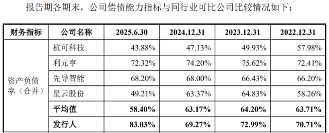此外,公司處於快速發展期,運營資金和固定資產等投入較大,公司資產負債率高於同行業可比公司平均水平。截至2025年6月末,恆翼能資產負債率達83.03%,高於行業均值的58.5%。公司解釋稱,主要系2025年上半年公司訂單激增,採購同步增加,導致應付賬款、應付票據大幅增加。