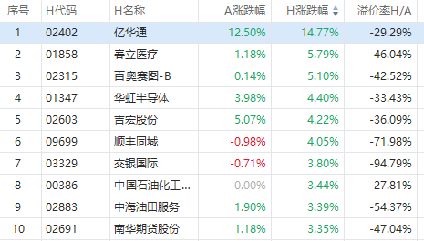 截至發稿,億華通H股漲超14%,A股漲超12%;春立醫療H股漲超5%,A股漲超1%;華虹半導體H股漲超4%,A股漲超5%。