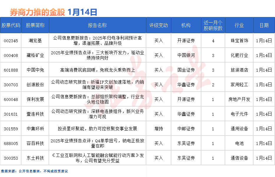 潮宏基最受券商關注,近一個月獲國信證券、國金證券等4份券商研報關注,僅1月14日就有開源證券、東吳證券等兩份券商研報關注,位居1月14日券商力推股榜首。