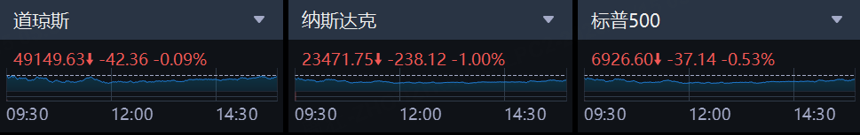 美東時間週三,美股三大指數集體收跌,其中納斯達克指數跌幅居前。截至收盤,道指跌42.36點,跌幅爲0.09%,報49149.63點;納指跌238.12點,跌幅爲1.00%,報23471.75點;標普500指數跌36.75點,跌幅爲0.53%,報6926.99點。