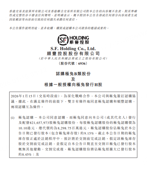 順豐控股與極兔速遞聯合發佈公告,宣佈達成一項戰略性的相互持股協議,將互爲對方增發新股,投資交易金額達83億港元。根據協議,順豐控股將向極兔速遞增發2.26億股H股股份,發行價爲每股36.74港元;極兔速遞將向順豐控股增發8.22億股B類股份,發行價爲每股10.10港元。交易完成後,順豐控股將持有極兔速遞10%的股份,極兔速遞將持有順豐控股4.29%的股份。