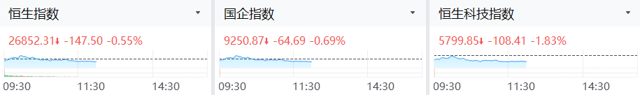 1月15日,港股三大指數齊跌,截止午間收盤,恒生指數跌0.55%,恒生科技指數跌1.83%,國企指數跌0.69%。