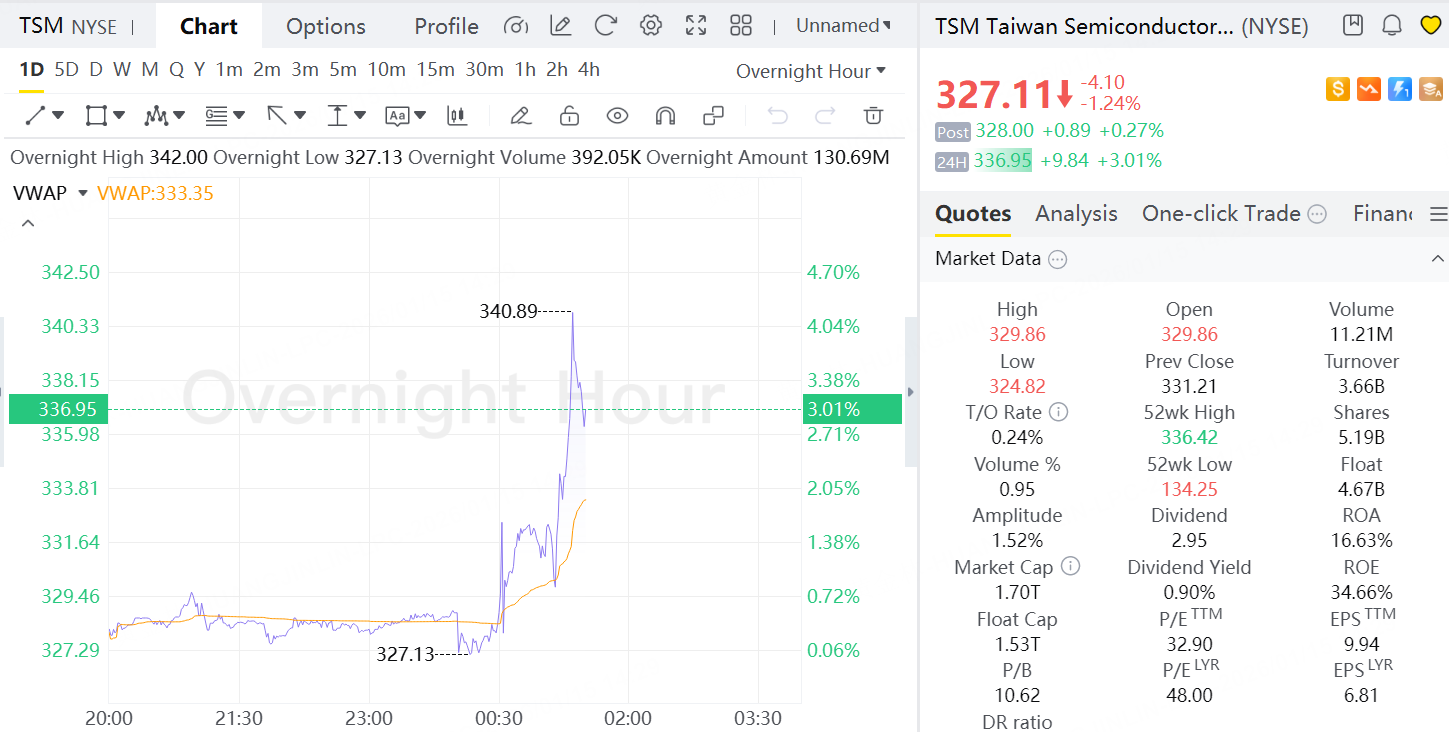 1月15日,臺積電Q4公佈的業績超預期,股價美股夜盤一度大漲3%: