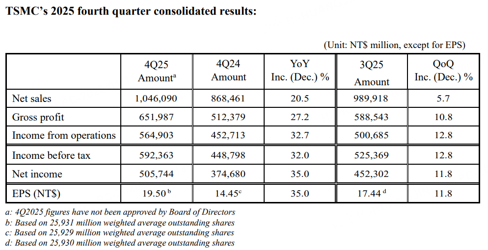 臺積電第四季度營收爲 10460.9億新臺幣,同比增長 20.5%;淨利潤 5057.4億新臺幣,同比大增 35%,顯著高於市場預期的 4670億新臺幣。季度毛利率爲 62.3%,同樣優於市場預期的 60.6%。