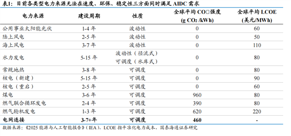 供給端看,現有電力資源在建設週期、調度能力與清潔程度之間均存在顯著代際差異:具備可調度能力的綠色能源建設週期普遍偏長,短期內無法匹配 AI 對於能源的快速需求;而
