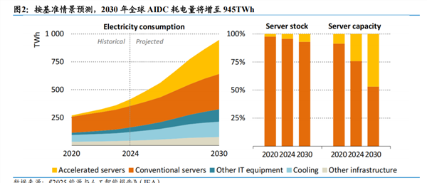從需求側看,國泰海通證券指出AI 大模型的訓練與推理依賴海量高性能芯片(如 GPU、ASIC)持續運行,對 AIDC 的電力保障提出極高要求。中國信息通信研究院測算表明,到 2030 年,我國數據中心年耗電量或將突破 4000億千瓦時,佔全社會用電比例接近 6%。國際能源署進一步預測,至 2030 年,全球數據中心電力消耗將增至約 945 太瓦時,佔全球總用電量比例略低於 3%,約爲2024 年水平的兩倍以上,並超過日本當前年度總用電量。隨着 AI 技術持續快速迭代,其對電力資源的消耗壓力正不斷加劇。