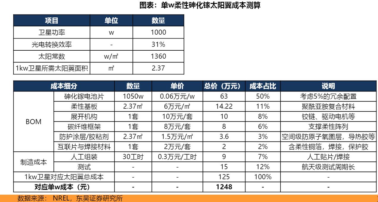 真正的破局者來自第三代光伏技術——鈣鈦礦。這種神奇的材料在過去十年間將實驗室效率從3.8%推升至接近35%的疊層轉換效率,更重要的是,它兼具了砷化鎵的高效率和晶硅的低成本優勢。中信證券測算顯示,鈣鈦礦生產成本僅爲1.63元/W,不到砷化鎵的百分之一。更關鍵的是其可柔性製備的特性,使得"太陽能帆板可摺疊發射後在軌展開"的構想得以實現,爲星鏈這類需要大面積展開的光伏陣列提供了完美解決方案。