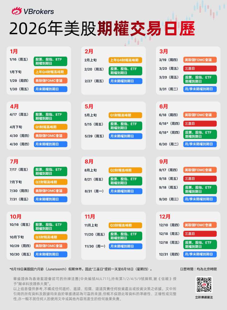對於期權交易者而言,交易日曆絕非簡單的日期羅列,而是串聯政策事件、交割節奏與市場情緒的重要脈絡。2026年,期權市場將迎來多個關鍵窗口期,從“財報高峰期”到“三巫日”,以及月、季度交割日,精準捕捉這些日子,才能在波動中掌握主動。