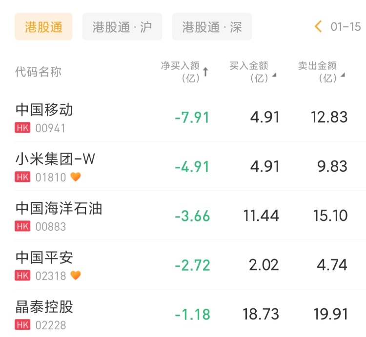 中國移動、小米集團-W 、中國海洋石油分別遭淨賣出7.91億港元、4.91億港元、3.66億港元。