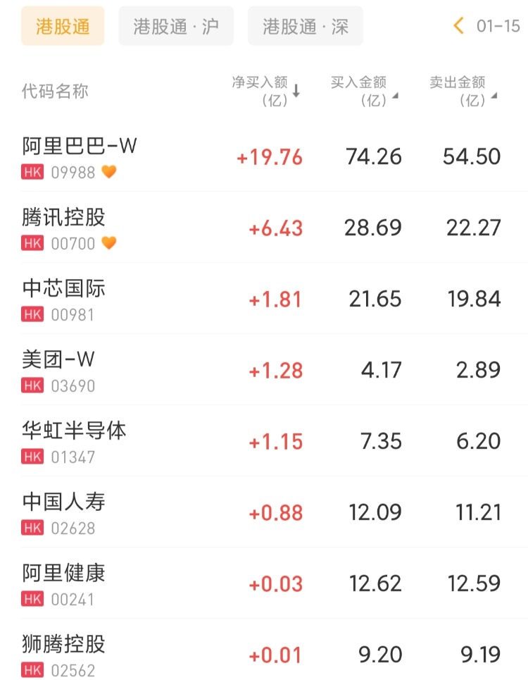 阿里巴巴-W、騰訊控股、中芯國際分別獲淨買入19.76億港元、6.43億港元、1.81億港元;