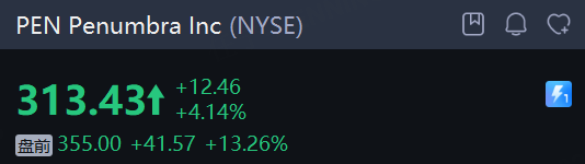 醫療器械公司Penumbra Inc漲超13%, 波士頓科學跌近4%,波士頓科學將以現金加股票方式收購Penumbra。