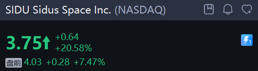 太空概念股 Sidus Space Inc. 續漲超7%,隔夜收漲超20%。