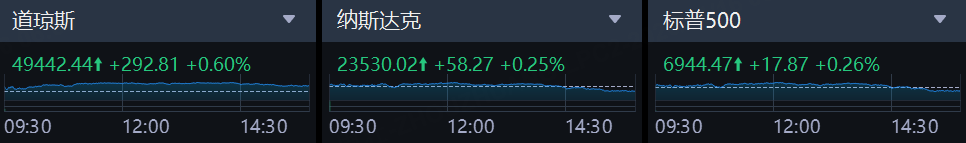 美東時間週四,美股三大指數集體收漲,截至收盤,道指漲292.81點,漲幅爲0.60%,報49442.44點;納指漲58.27點,漲幅爲0.25%,報23530.02點;標普500指數漲17.87點,漲幅爲0.26%,報6944.47點。