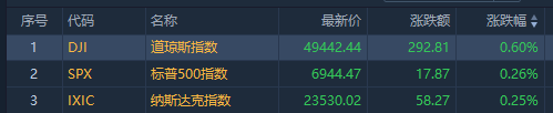 美股三大指數集體收漲,截至昨夜收盤,道指漲292.81點,漲幅爲0.60%,報49442.44點;納指漲58.27點,漲幅爲0.25%,報23530.02點;標普500指數漲17.87點,漲幅爲0.26%,報6944.47點。