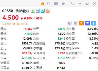 華盛資訊1月16日訊,優然牧業盤初一度大跌逾5%,截至發稿,現漲4.65%,報4.5港元,成交額12.6億港元。