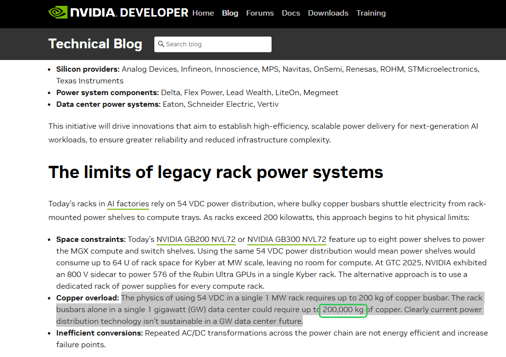 1月16日,針對外界的質疑,英偉達已將其一篇技術論文中有關數據中心銅需求量數據進行了改正,將傳統數據中心一吉瓦機架的銅母線用量修正爲200噸,僅爲原論文表述“50萬噸”的0.04%。這也意味着數據中心銅需求預期需要被大幅調低。
