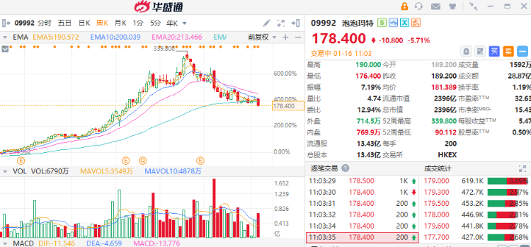華盛資訊1月16日訊,港股新消費概念早盤領跌,泡泡瑪特一度跌超6%創近八個月新低。