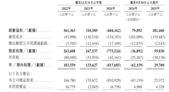 公司於2022年-2023年權益股東應占利潤(下同)分別爲1.67億元、1.36億元;2024年由盈轉虧,虧損8.11億元;2025年首9月扭虧爲盈,利潤爲2537.2萬元。