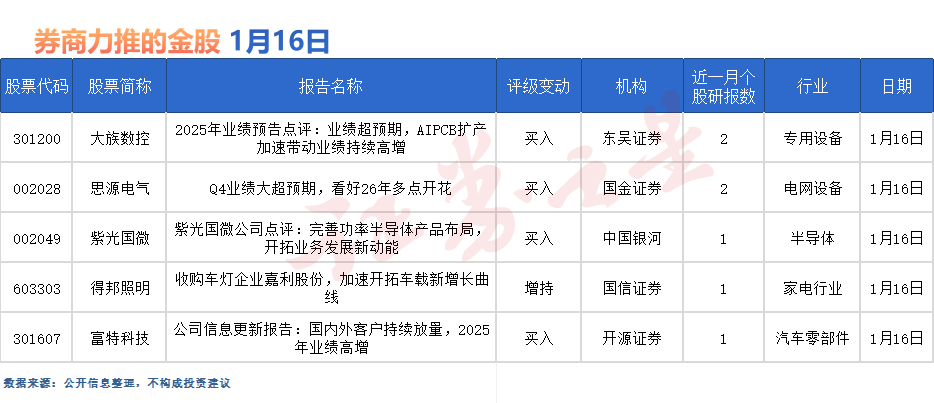 大族數控最受券商關注,近一個月獲愛建證券等2份券商研報關注,位居1月16日券商力推股榜首。