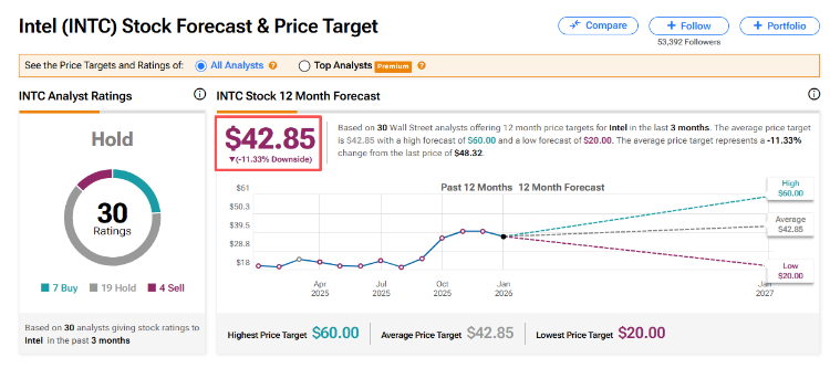 據TipRanks最新數據顯示,分析師們對於英特爾的未來走勢依然保持謹慎態度,過半數機構僅給予“持有”評級,當前平均目標價爲42.85美元,最高目標價60美元,較現價上漲空間爲24%。