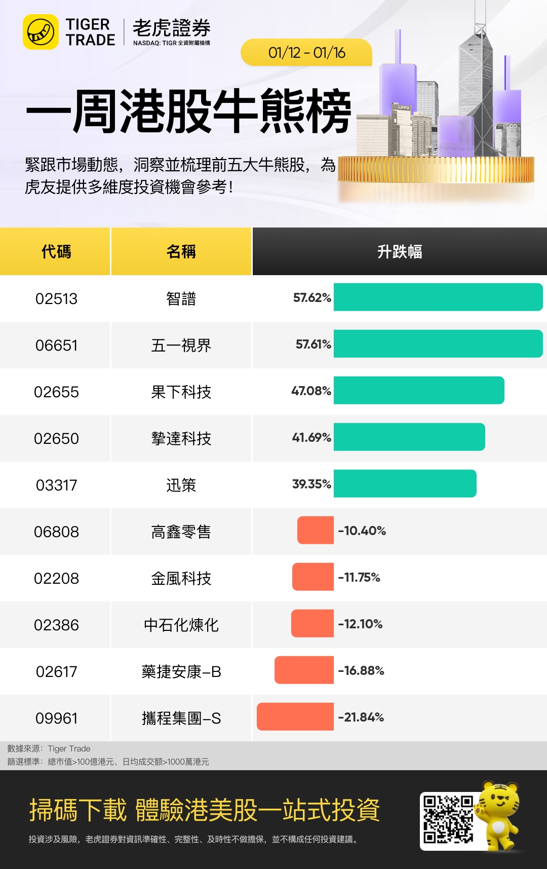 本週市值百億以上、日均成交千萬以上表現最好五隻股票是: 智譜、 五一視界、 果下科技、 摯達科技 、 迅策;