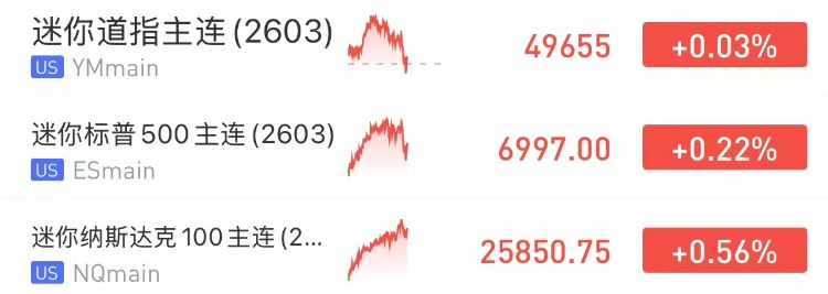 美股三大股指期貨盤前齊漲,截至發稿,納指期貨 $NQmain 漲0.56%,標普500期貨 $ESmain 漲0.22%,道指期貨 $YMmain 微漲0.03%。