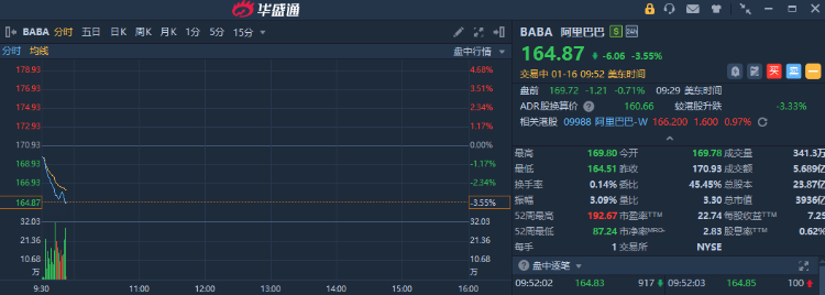 華盛資訊1月16日訊,熱門中概股盤中普跌,阿里巴巴跌逾3%,京東、百度跌逾1%;網易逆勢漲逾1%。
