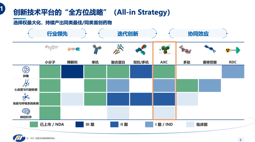 更關鍵的是,這套龐大的研發體系是依託於平臺化、系統化且持續迭代的創新引擎。恆瑞的“全方位”技術平臺戰略(All-in Strategy),涵蓋了所有主要治療模式,包括小分子、大分子(如抗體)、AXC、降解劑、多肽等。