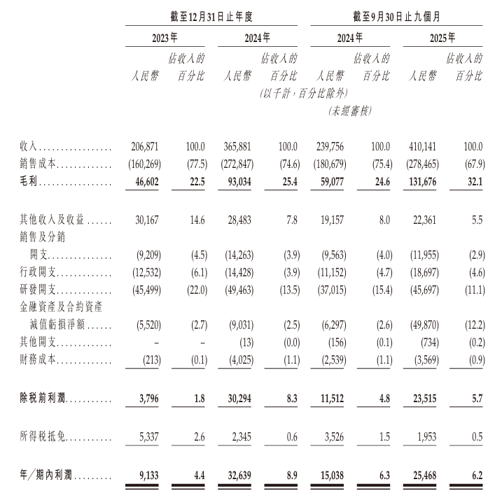 業績層面,玖物智能近年來更呈現出高速增長的態勢。收入由2023年2.07億元(人民幣,下同)增長76.9%至3.66億元,2025年首9月收入同比增長71.07%至4.1億元,超出2024年全年水平。淨利潤則由2023年的910萬元激增257.4%至3260萬元,2025年首9月同比增長69.4%至2550萬元。