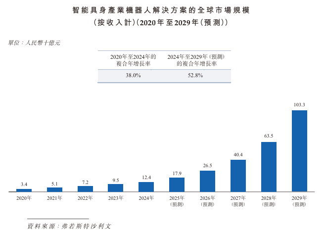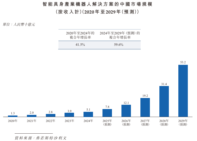 2024年,按收入計,中國智能具身產業機器人解決方案的前五大解決方案供應商合計約佔總市場份額的31.8%,公司是中國第二大智能具身產業機器人解決方案供應商。