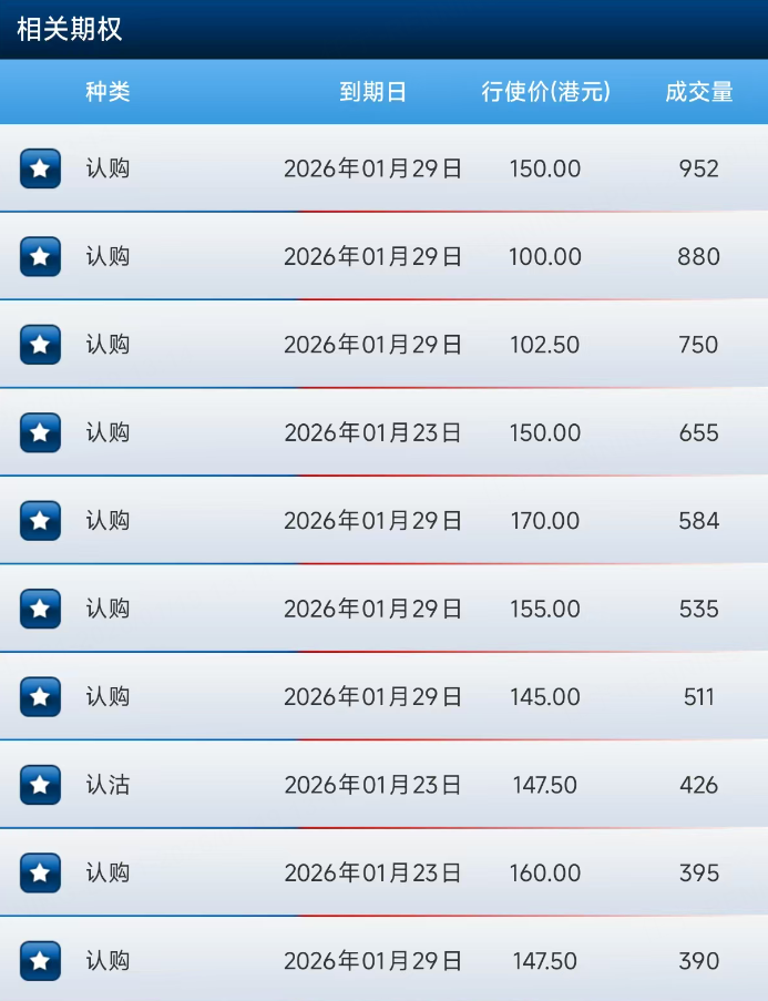 百度上午排名前七位的都是認購合約,前十大成交中九張認購合約。最高認購行權價達170港元,到期日爲1月29日。