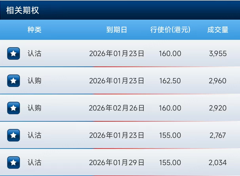 期權方面,阿里排名第一的是一份認沽期權,到期日爲本週五,行權價160港元。