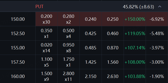 阿里的PUT價格大漲,一張週五到期、行權價150港元的合約,價格暴漲150%。